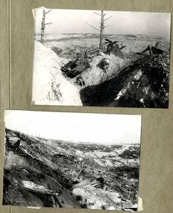 Photographies de champs de bataille (tranchées, chars...), de bâtiments et constructions en ruines notamment à Reims.