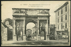 Porte Sainte-Catherine construite en 1752. – Vers 1903-1917. – 1918 (oblitération). – 1918 (correspondance). – Noir et blanc. – Imprimeries Réunies, Nancy. – Même cliché que 106 Fi 2934, 2935. • 1903-1917 Voir dans l'inventaire Ajout à votre panier