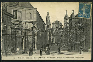 Préfecture. Grilles de Jean Lamour, rue de la Constitution, Cathédrale. – Vers 1903-1914. – Noir et blanc. – Royer, Nancy. • 1903-1914 Voir dans l'inventaire Ajout à votre panier