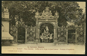 Place Stanislas. Grilles en fer forgé de Jean Lamour. Fontaine d'Amphitrite. – Vers 1904-1905. – Noir et blanc. – P. Helmlinger et Cie, Imp. Phot., Nancy. – Même cliché que 106 Fi 591. • 1904-1905 Voir dans l'inventaire Ajout à votre panier