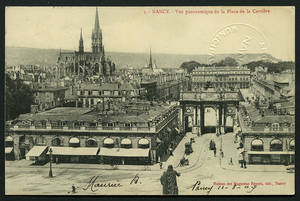Vue panoramique sur la Place de la Carrière. – Vers 1903-1906. – 1909 (oblitération). – 1909 (correspondance). – Noir et blanc. – Maisons des Magasins Réunis, édit., Nancy. – Même cliché que 106 Fi 1041, 1044, 1051, 1054, 1083, 1084. • 1903-1906 Voir dans l'inventaire Ajout à votre panier