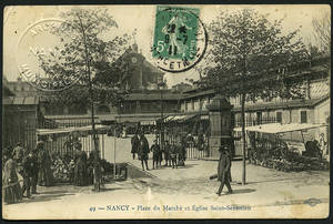 Cartes postales de Nancy Commerces et services Marché Place du marché et église Saint-Sébastien. – Vers 1903-1911. – 1911 (oblitération). – Noir et blanc. – Royer et Cie phot., Nancy. • 1903-1911 Voir dans l'inventaire Ajout à votre panier Tweet Scoop.it Description Documents Ajouter un commentaire Date de l'unité documentaire 1903-1911 Statut juridique Archives de statut juridique mixte (6 Fi, origine publique ; 106 Fi, origine privée). Descripteurs Grand domaine de recherche : Collections iconographiques Sujet : commerce Type : carte postale Cotes extrêmes : 106 Fi 1175 Documents relatifsImages