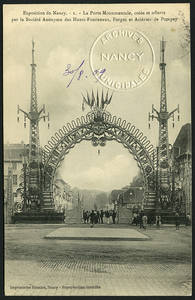 La porte monumentale, créée et offerte par la société anonyme des hauts-fourneaux, forges et aciéries de Pompey. – Vers 1909. – 1909 (oblitération). – 1909 (correspondance). – Noir et blanc. – Imprimeries Réunies, Nancy. – Même cliché que 106 Fi 1274, 1275. • 1909 Voir dans l'inventaire Ajout à votre panier