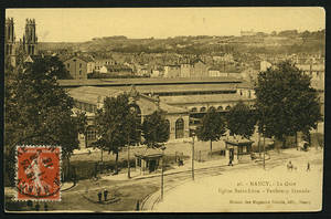 La gare. Eglise Saint-Léon. Faubourg Stanislas. – Vers 1903-1906. – 1913 (oblitération). – 1913 (correspondance). – Sépia. – Maisons des Magasins Réunis, édit., Nancy. – Même cliché que 106 Fi 2247, 2248, 2249, 2258. • 1903-1906 Voir dans l'inventaire Ajout à votre panier